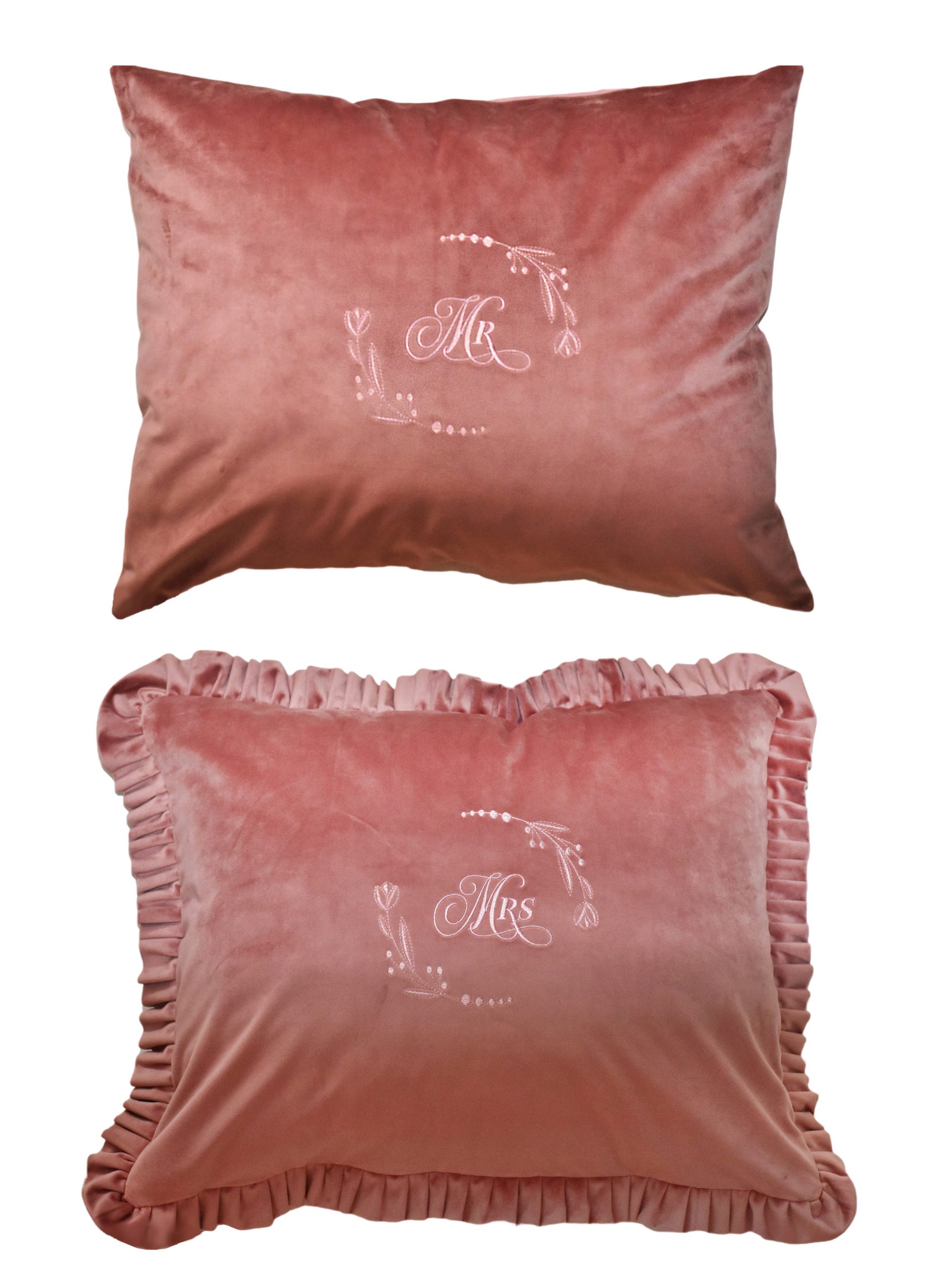 Puha bársony nagy párnahuzat szett személyre szabható felirattal vagy mintával hímezve (pl. Mr., Mrs., Happily Ever After, Bride, menyasszony, név, stb.)
